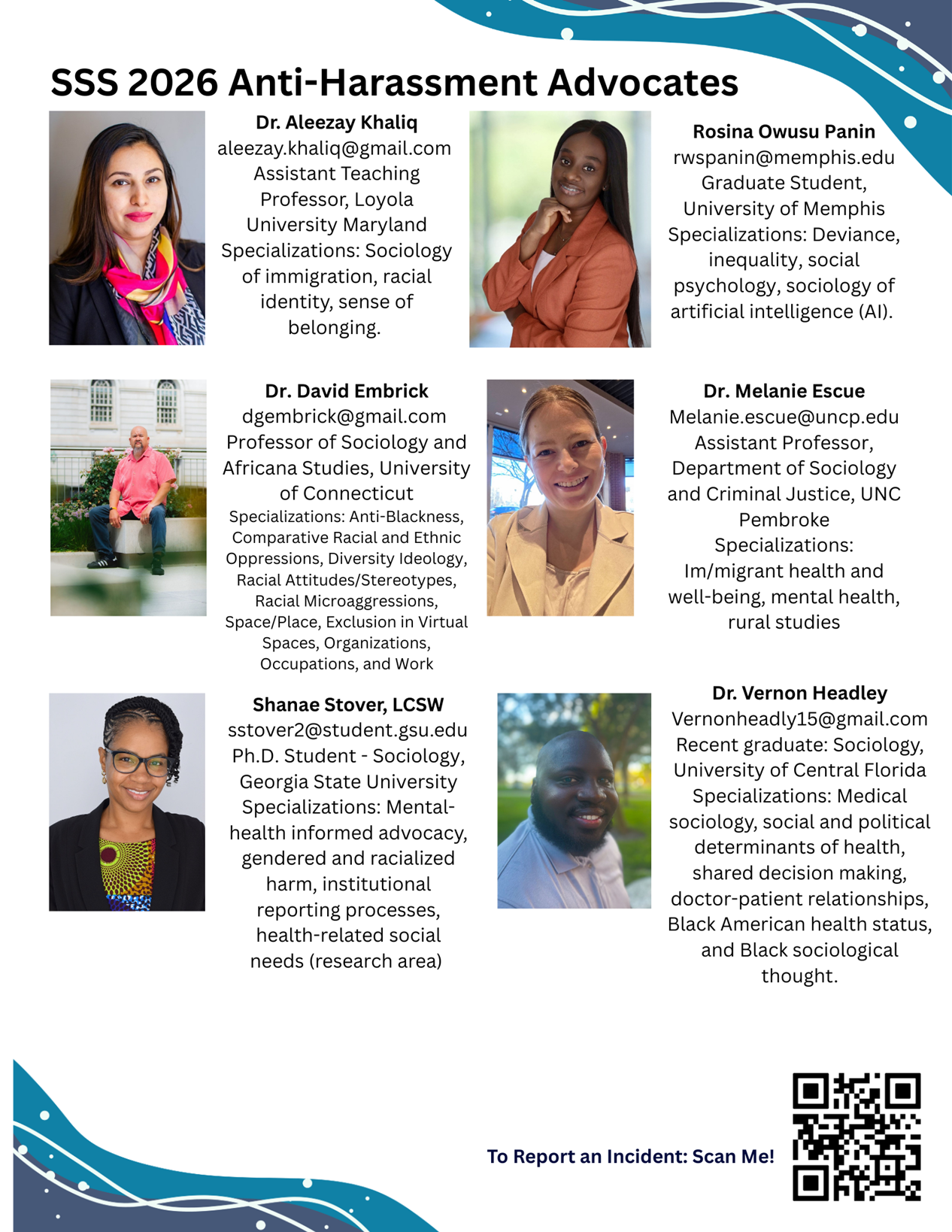 To report an incident of harassment related to membership and participation in the Southern Sociological Society or request support from SSS advocates, please click here to fill out our form. Please note that while our committee is committed to making the SSS annual conference a harassment-free zone, we are also here to support our community throughout the year. Please do not hesitate to reach out to us if you are in need of assistance outside of the conference.